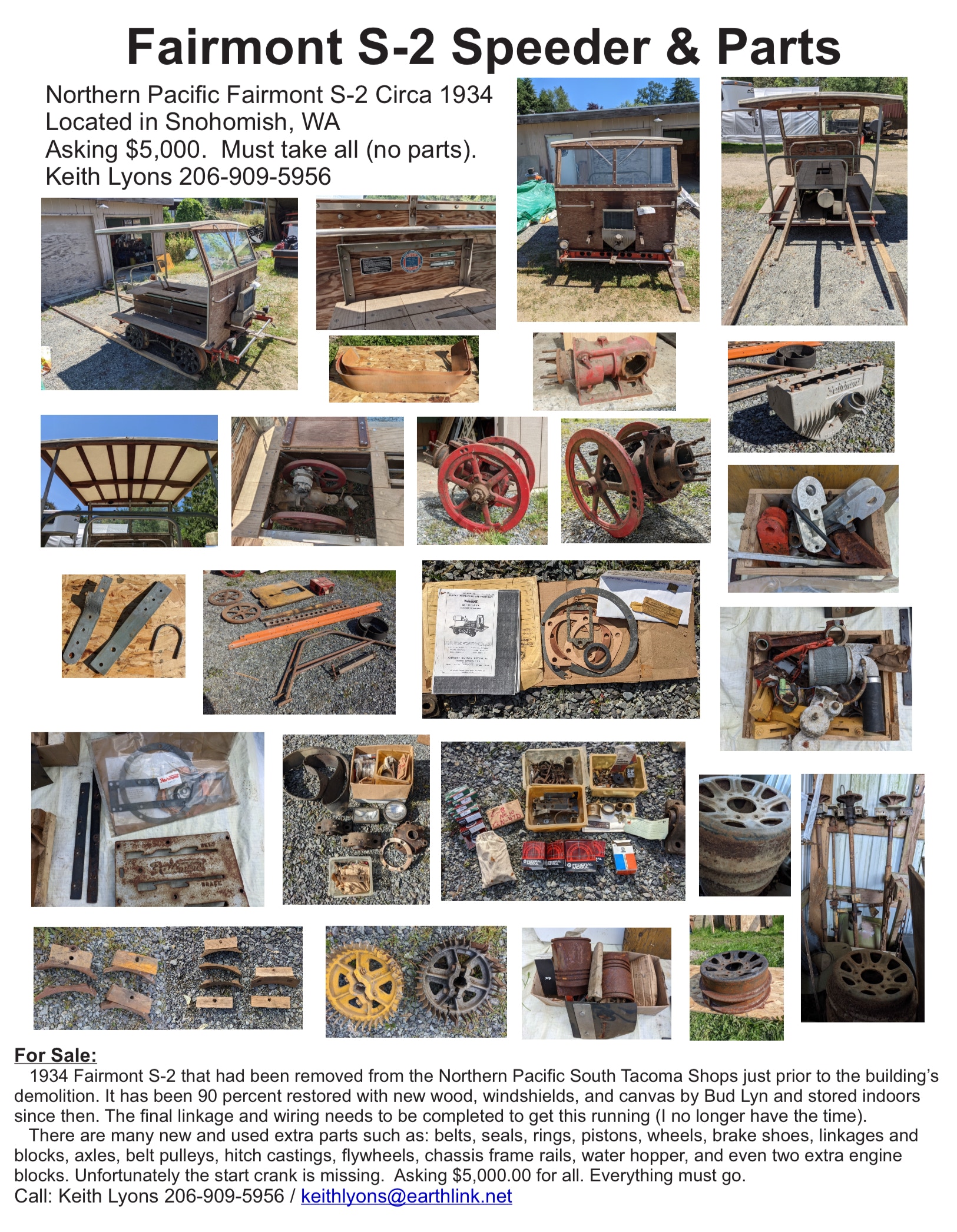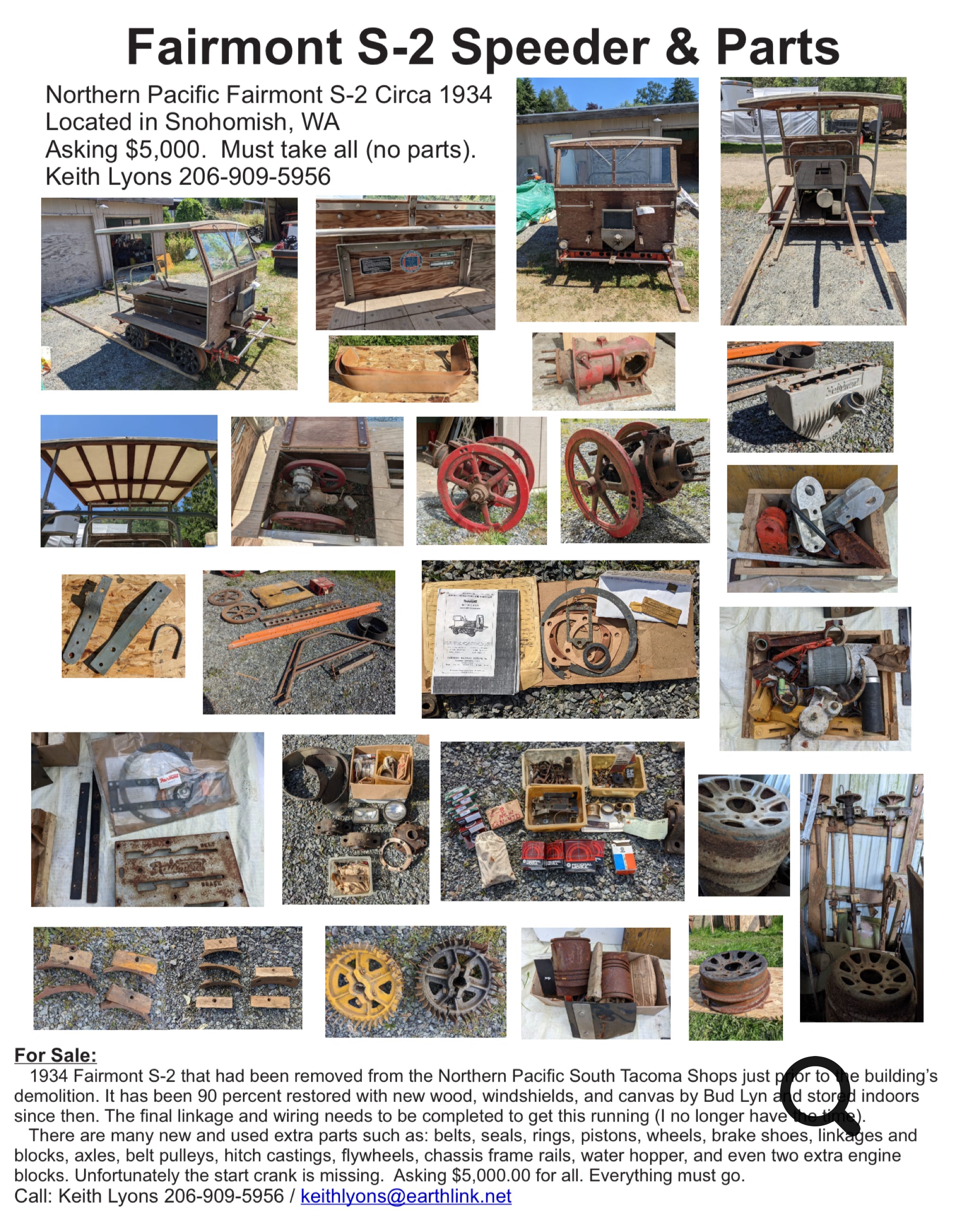 The railcar was originally on Burlington Northern's Pacific Division, assigned to the Ballard, Wa. signal department. I acquired it from a couple who wanted to use it on the Pend Oreille Valley RR in Cusick, Wa. by the Canadian border. I had the gas tank cleaned and lined, and rebuilt the carburetor, fuel lines, and put an Edelbrock electric fuel pump on it. I disassembled the engine, lapped the valves and re-ringed it. It has a recent battery, new starter, new coil, wires and points, new voltage regulator, and an emergency 300 amp battery cutoff switch. It runs and operates well-except it not being up to club standards, it could be run on the rails right now. The air system I built powers the brass whistle on top, as well as the authentic caboose crossing whistle on back. I haven't put a compressor on it; I charge it up with my compressor to show how it works.The seat has new foam and covering. I will sell it with a few extra parts I have, including an extra wheel, mechanical fuel pump, and other things. It needs wiper motors, the left oval window glass, and the left front windshield has a crack in it. The front headlights are as bright as a locomotive. The brake light works as well. I am asking $2,100.00. If you have any other questions I will answer as best i can. Location: Spokane Valley, WA